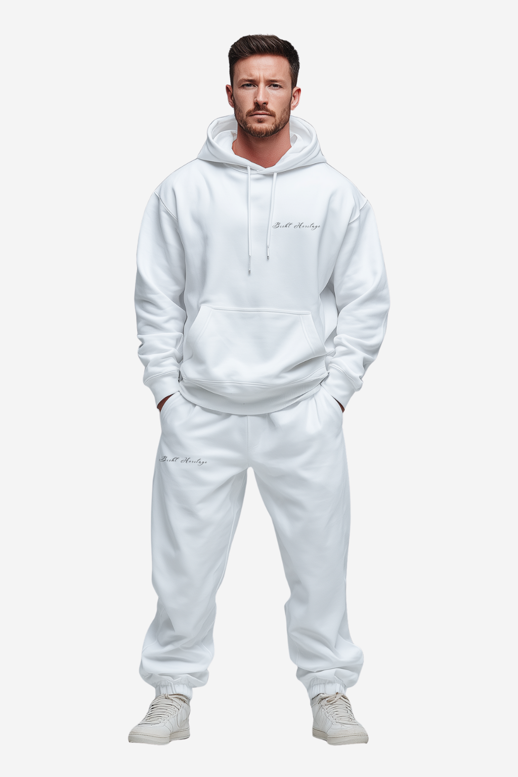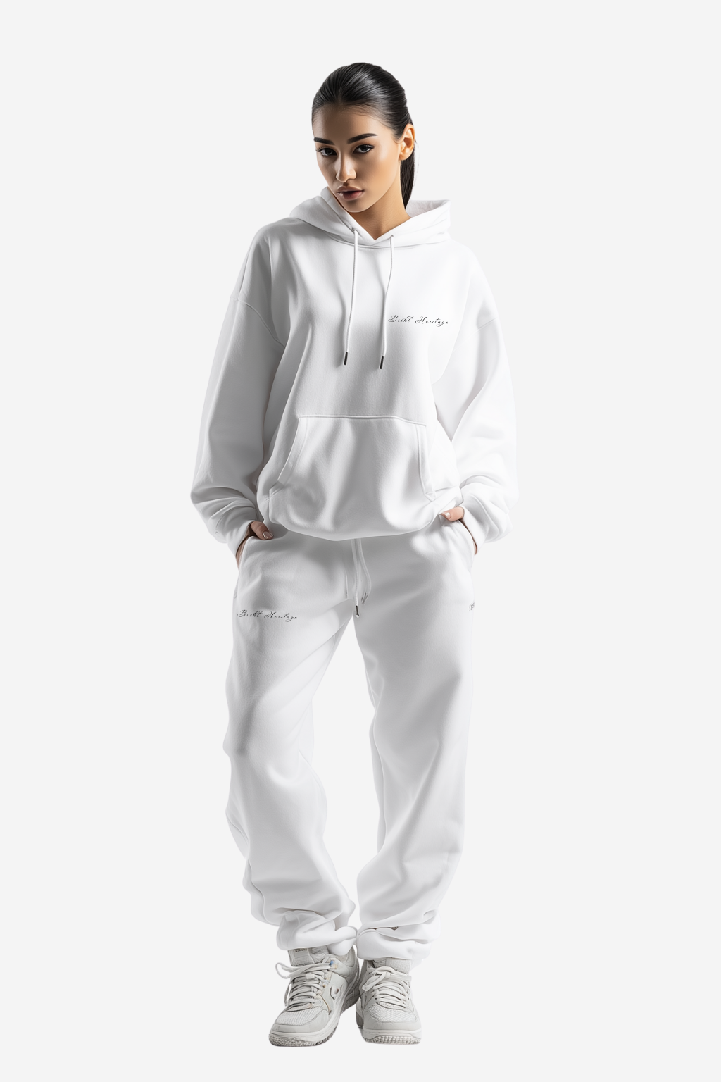Matching hoodie and sweatpants in pure frost white — the look of clarity and control.