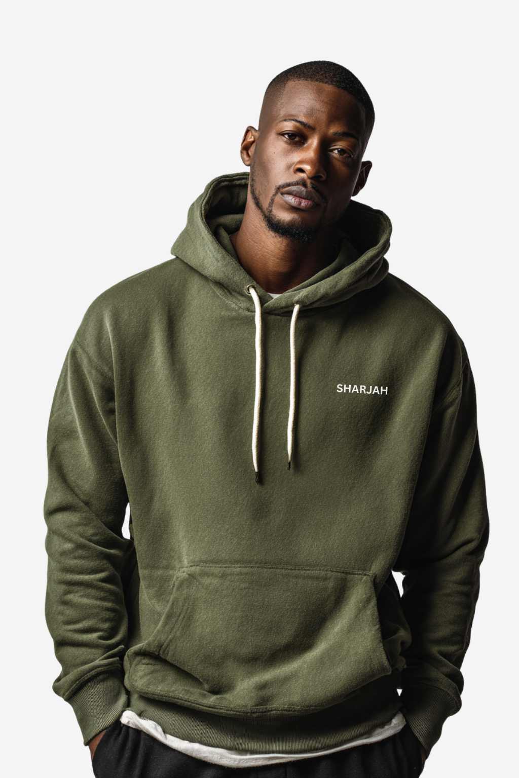 A classic infused with grounded elegance. The Dar AlAsala Hoodie in Olive Green embodies Sharjah’s cultural depth and steady character through a clean, oversized silhouette — crafted to honor the UAE’s 54th National Day with a modern, earthy edge.